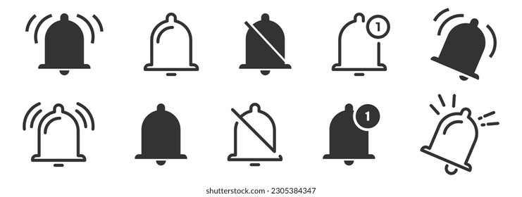 ベル通知とシンプルな黒のアイコンセットを鳴らします。ベルをミュートし、音が出ず、ベルが鳴ります。孤立した白い背景のベクトル。のイラスト素材・ベクターImage 158639978。