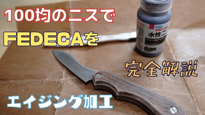 100均ダイソーのニスで、キャンプ道具の持ち手の木材をDIYでエイジング加工、DIYビンテージ加工をしました。使用したのはFEDECAの創って楽しむナイフ 折畳式料理ナイフ No0029。