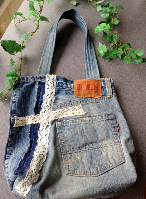 元々のジーンズのデザインをほぼ残したリメイクバッグ ジーンズリメイクGパンバッグの作り方Gパンをバッグにリメイク7つのコツ で上手に出来る♪デニム・ジーンズバッグの作り方。