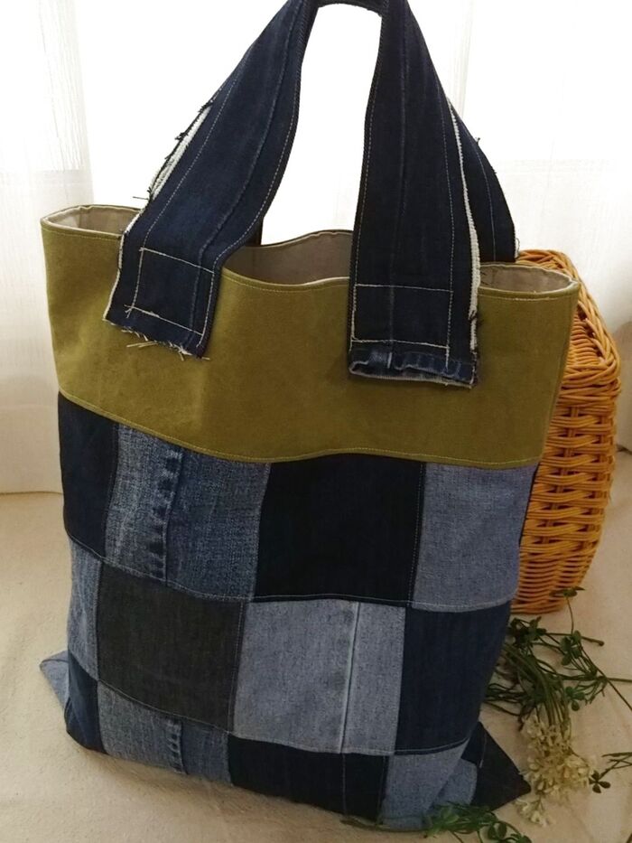 デニムリメイクバッグ S トートバッグハンドメイド ジーンズそのままトートバッグの作り方 ジーンズリメイクG。