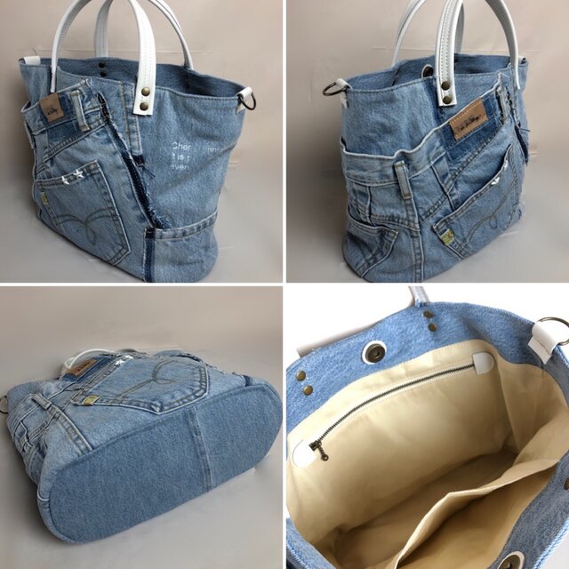 デニムリメイクバッグ ライトブルー×ホワイトiichi 日々の暮らしを心地よくするハンドメイドやアンティークのマーケットプレイス。