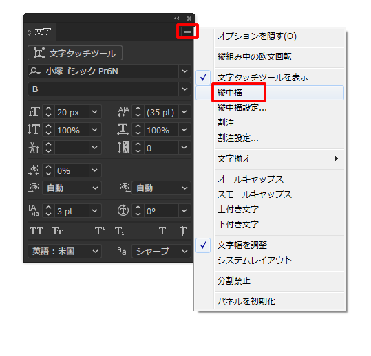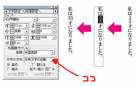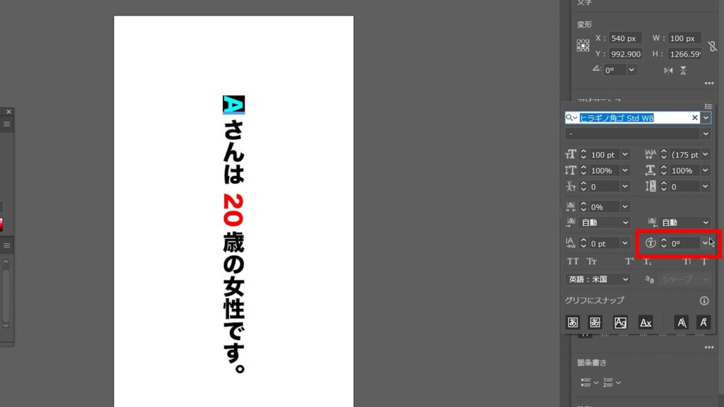 現場でつまずいたこと、学んだことAI・文字編2 ○縦中横と縦組み中の文字回転 – クリエイティブスポット。