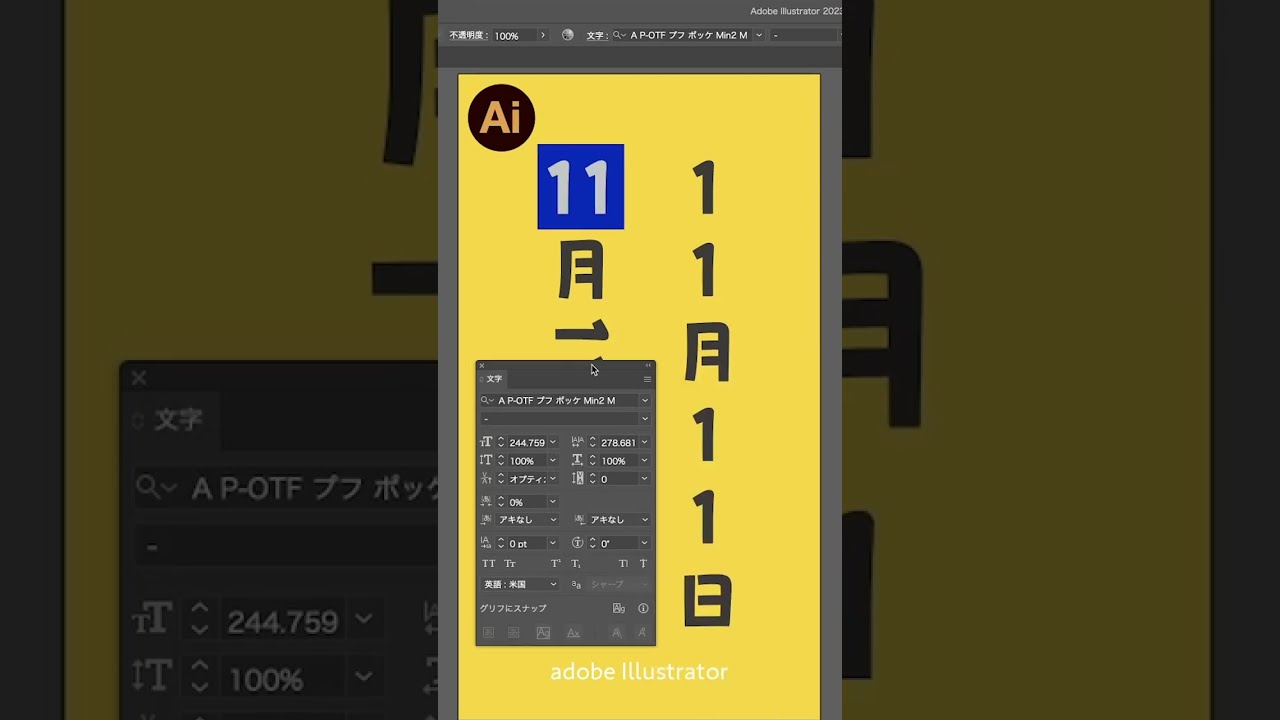 イラレの縦書きで数字の2桁を横にするadobeillustrator。