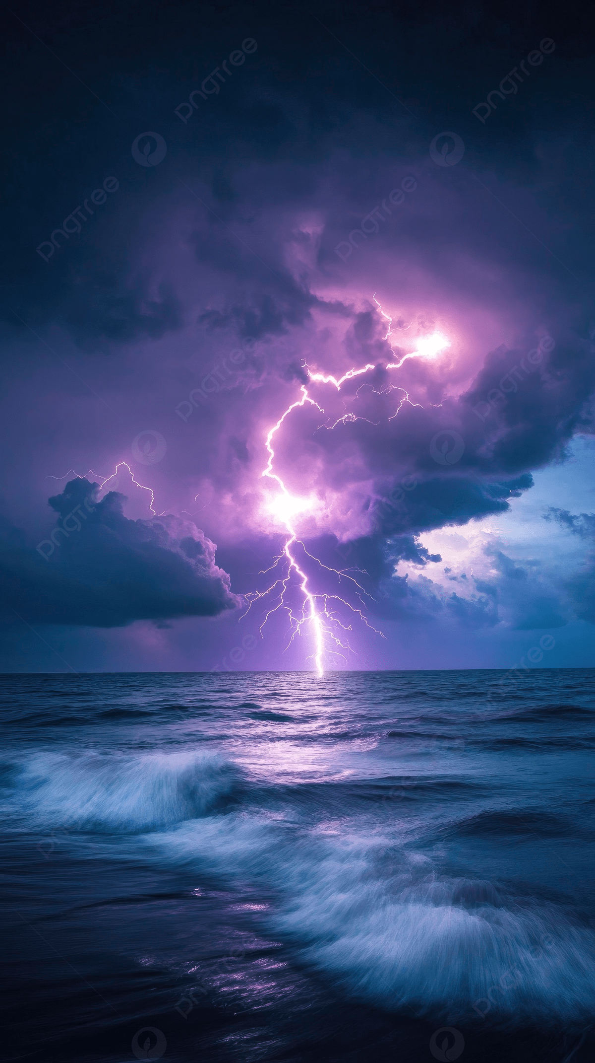 複数の場所で紫色の稲妻が落ちる海上の雷雨背景 無料ダウンロードのための壁紙画像 - Pngtree。