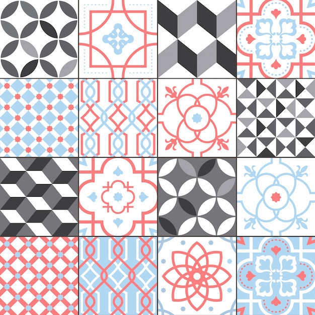 異なるタイルパターンコレクション。カラフルでモノクロの幾何学模様セット。伝統とモダンの飾りイラスト。Premiumベクトル素材。