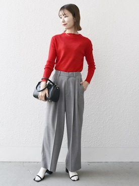 赤×グレーコーデ🍅 赤とグレーって相性いいな! このニット、色違いもほしいなと思ってたのに いきなり夏みたいな暑さで迷ってる🤦🏻♂️tops@uniqlo_jp pants@gu_for_all_ cap@supremenewyork bag@celineshoes@pumaスムースコットンクルーネックセーター。