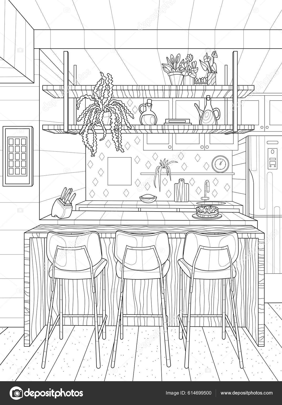 バースツール付きのキッチンインテリア 大人向けのぬり絵 部屋のインテリア 白黒のイラスト ストックベクター ©meine.illustrations614699500。