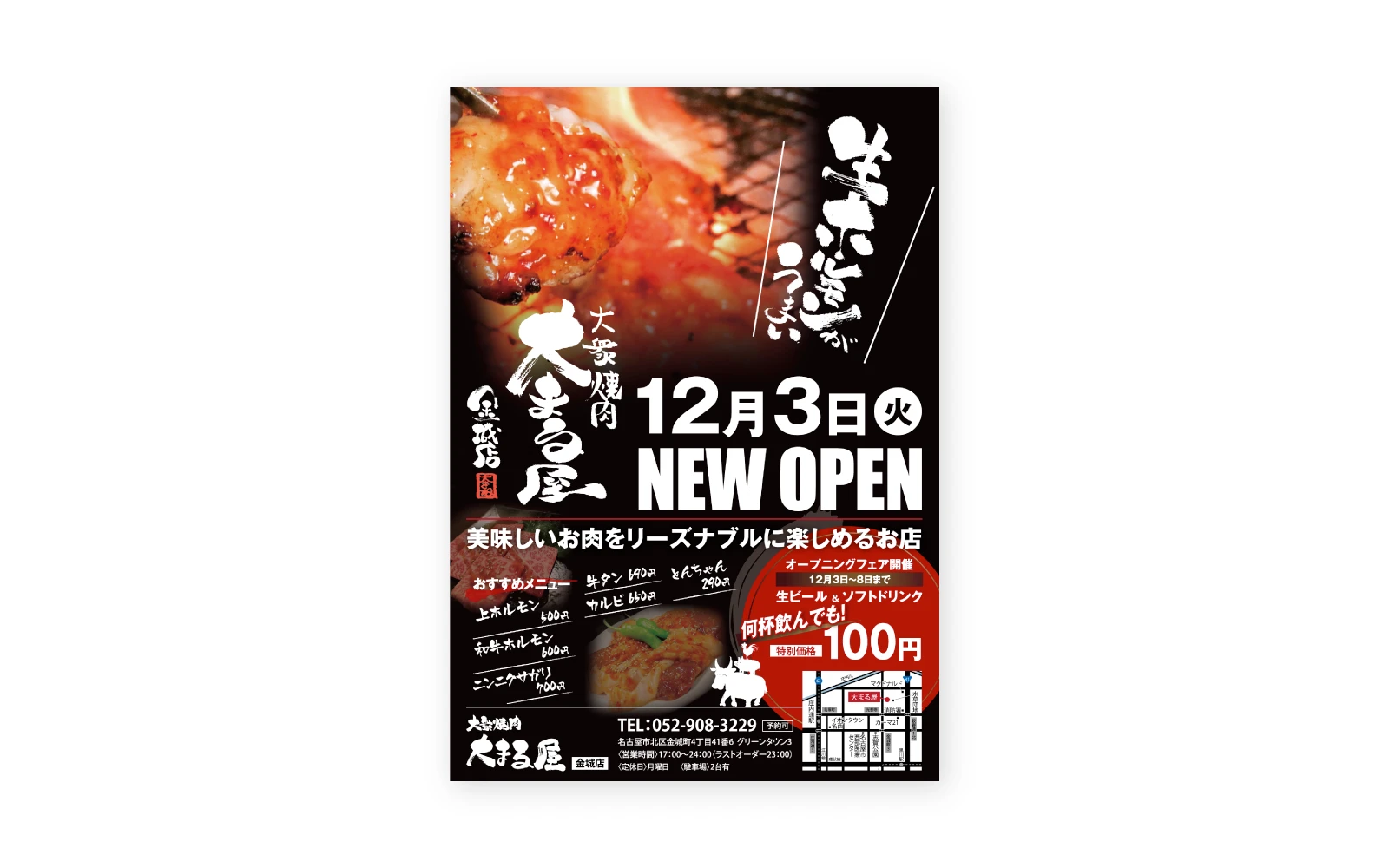 大衆焼肉大まる屋 オープン告知A5チラシデザイン - 名古屋のホームページ制作・デザイン制作 - 株式会社SPD。