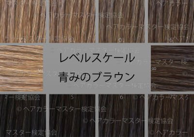 ヘアカラー明度スケールデータ 青みのブラウン クールブラウン 寒色 アッシュ モノトーン プラチナ シルバー グレイ 髪色見本 ヘアカラーリングレベルスケールヘアカラーマスター検定協会 ICHM。