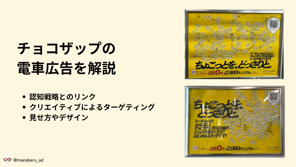 広告クリエイティブ学べます on X: " チョコザップの広告戦略がすごいので解説今回は、劇的に会員数を伸ばしているチョコザップの電車広告について、解説していきます🚃1つの電車広告をピックアップした形となりますが、広告の戦略・テクニック・デザインにおいて。