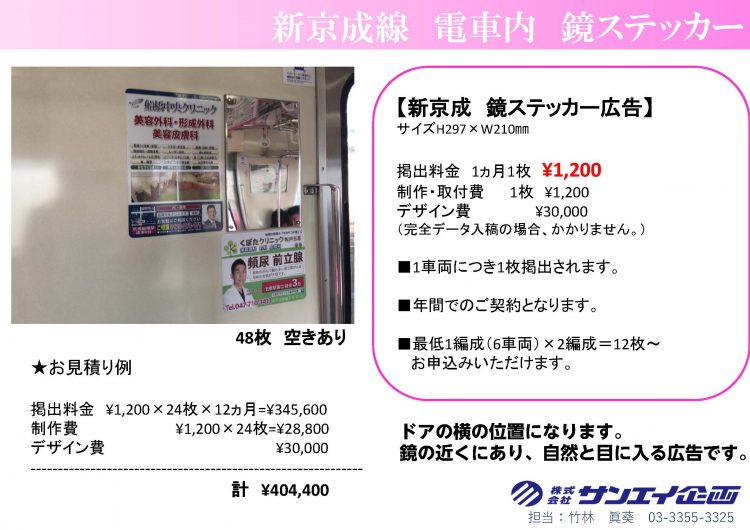 新京成 電車内 鏡ステッカー広告~1ヶ月1枚@1200円の格安で電車に広告掲載可能~キャンペーン情報交通広告のサンエイ企画。