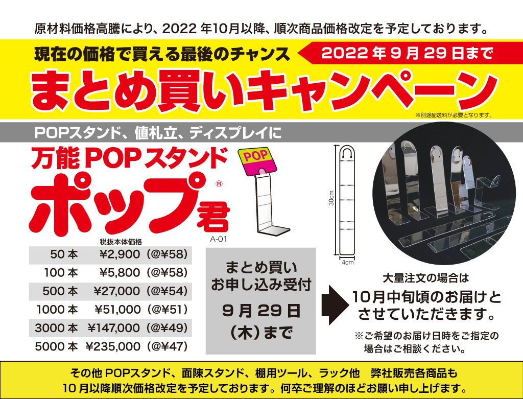 万能POPスタンド『ポップ君』価格改定前キャンペーンのお知らせイガラシプロ有限会社。