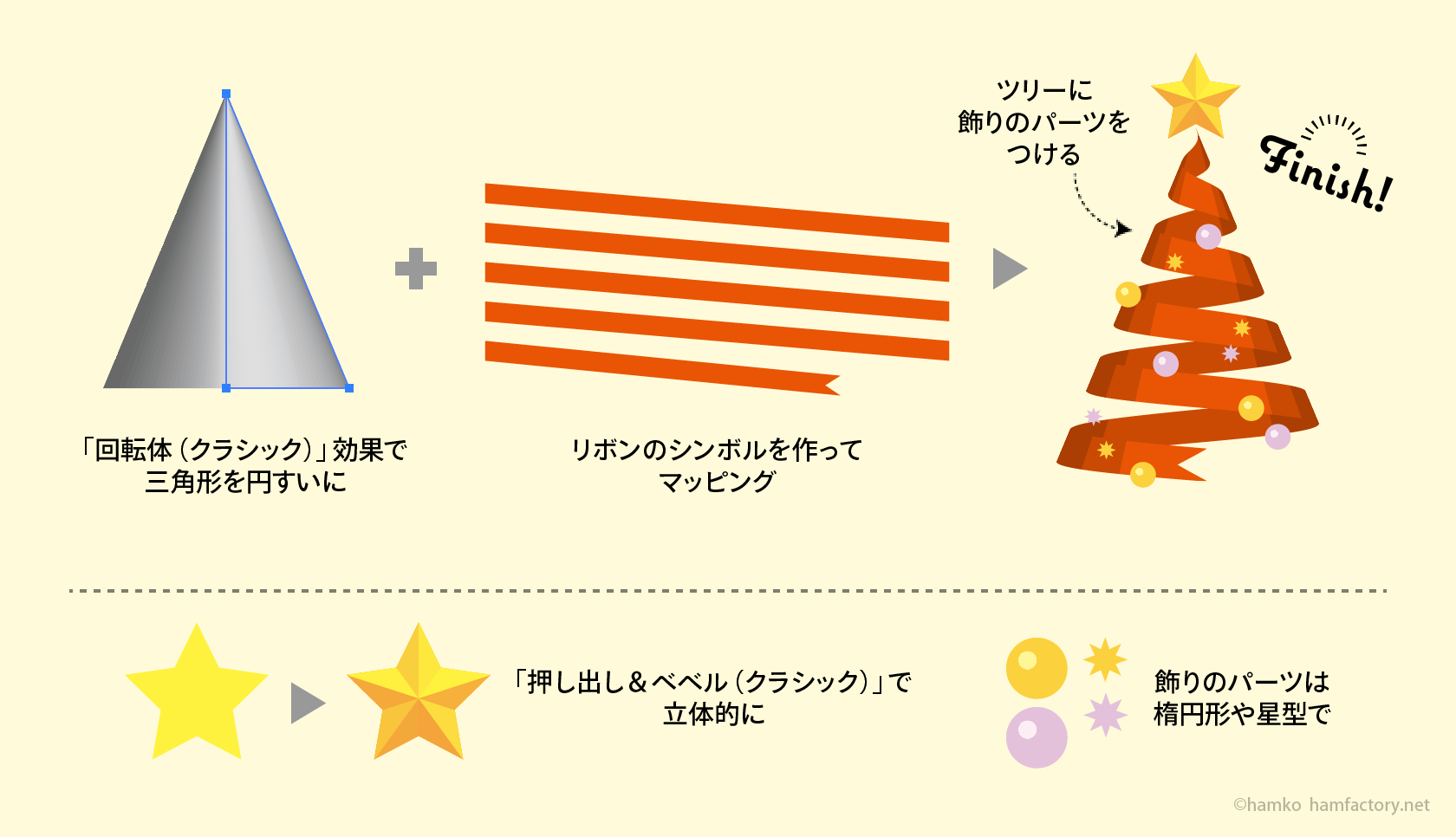 イラレであそぼ 3D効果でくるくるリボンツリーを描こう - hamfactory。