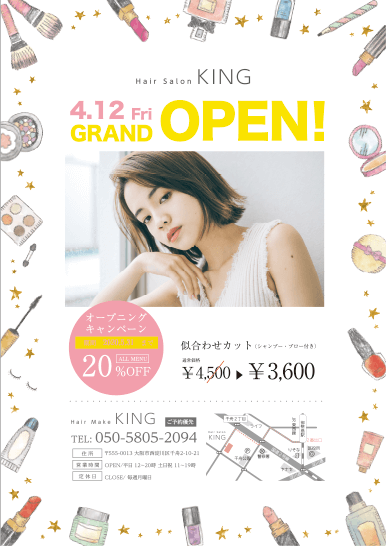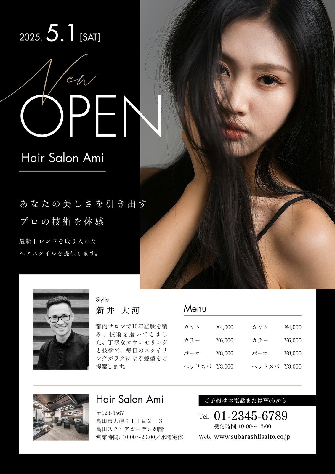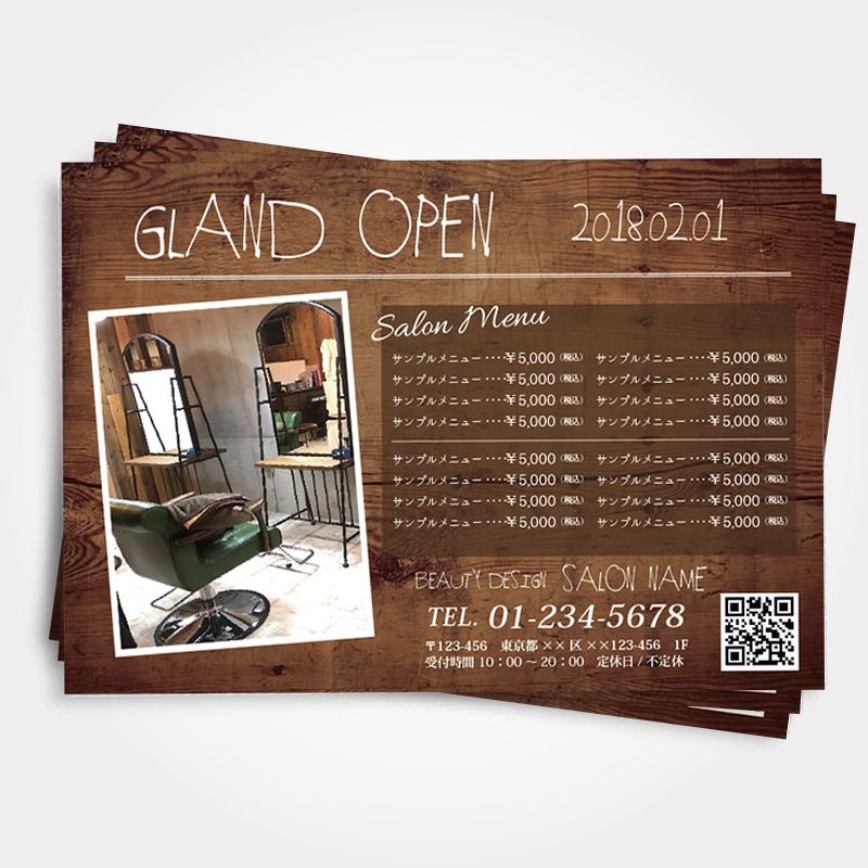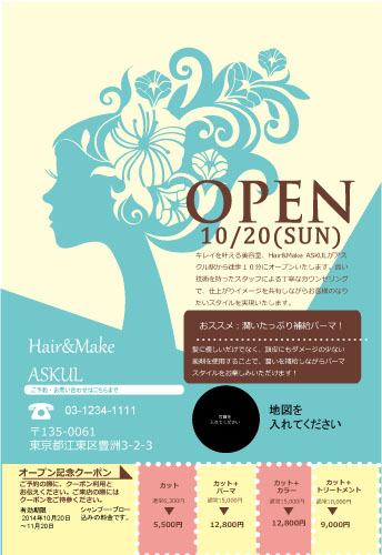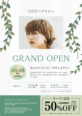 美容室・ヘアサロン_開業・オープンチラシ・フライヤーの無料デザインテンプレート - ネット印刷グラフィック。