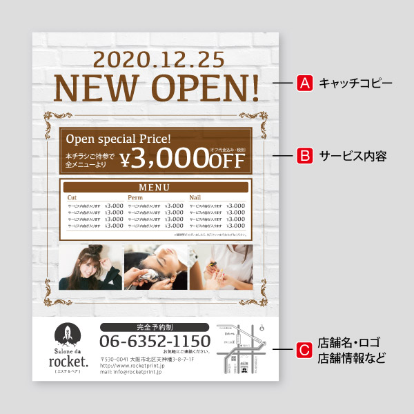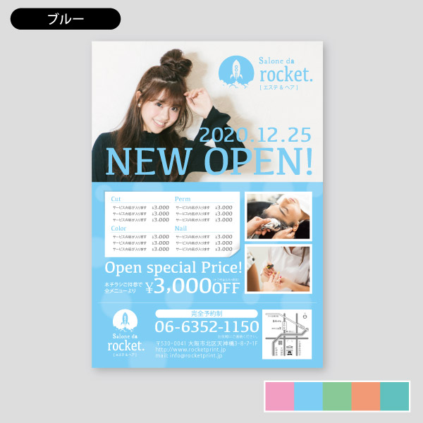 美容室サロンのオープン用1チラシ印刷のロケットプリント。