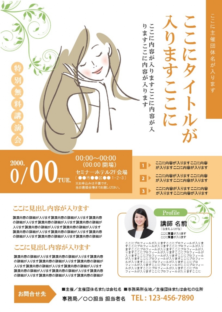 美容系セミナーチラシデザインテンプレート No.066 オレンジチラシテンプレートセンタ。