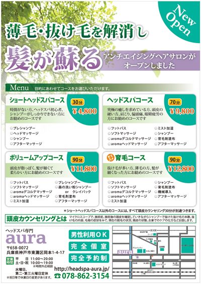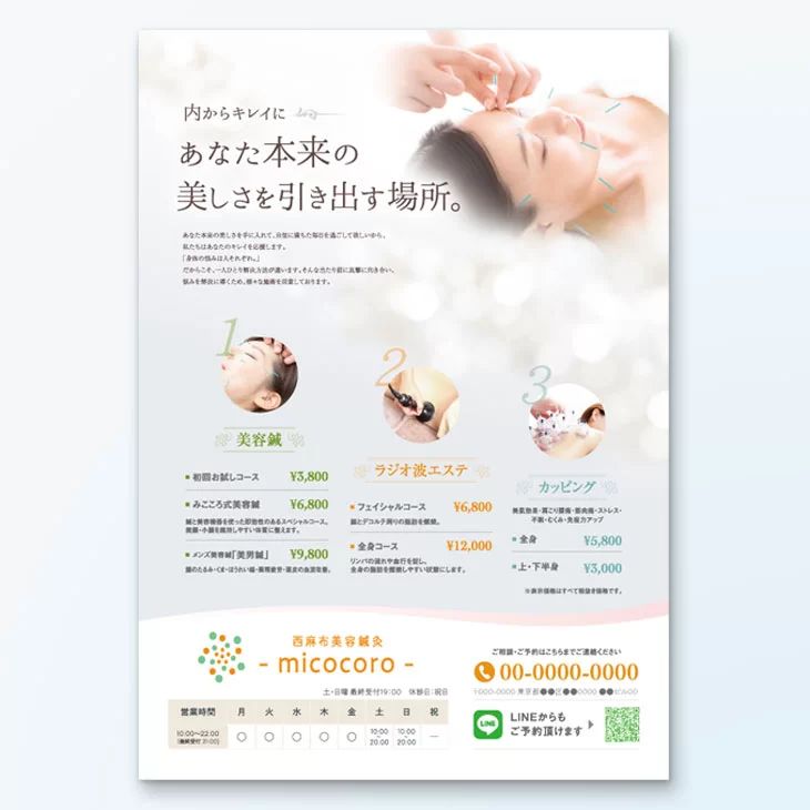 美容室併設の美容鍼灸サロンの販促チラシ作成事例チラシ作成専門 デザイン+印刷のCHIRASAKU チラサク。
