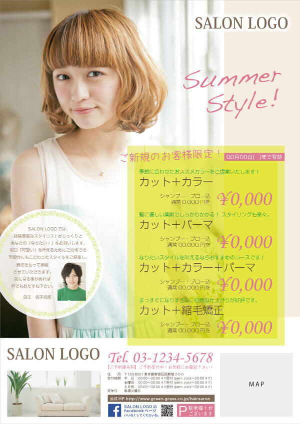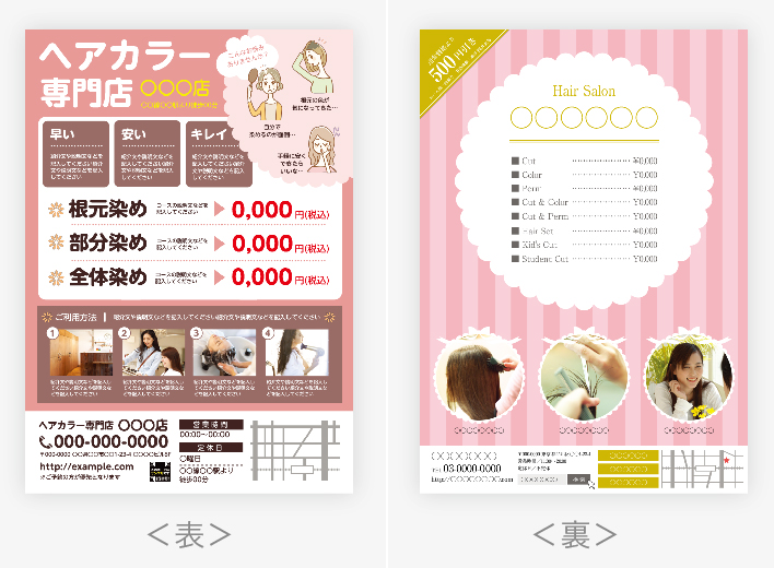 美容室・ヘアサロンのチラシ無料テンプレート・デザインサンプル - ネット印刷グラフィック。