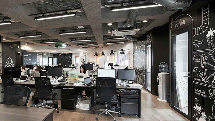 壁に描かれたグラフィックデザインがおしゃれ!開放感溢れるワンフロアオフィス - オフィスデザインの株式会社ワーク。