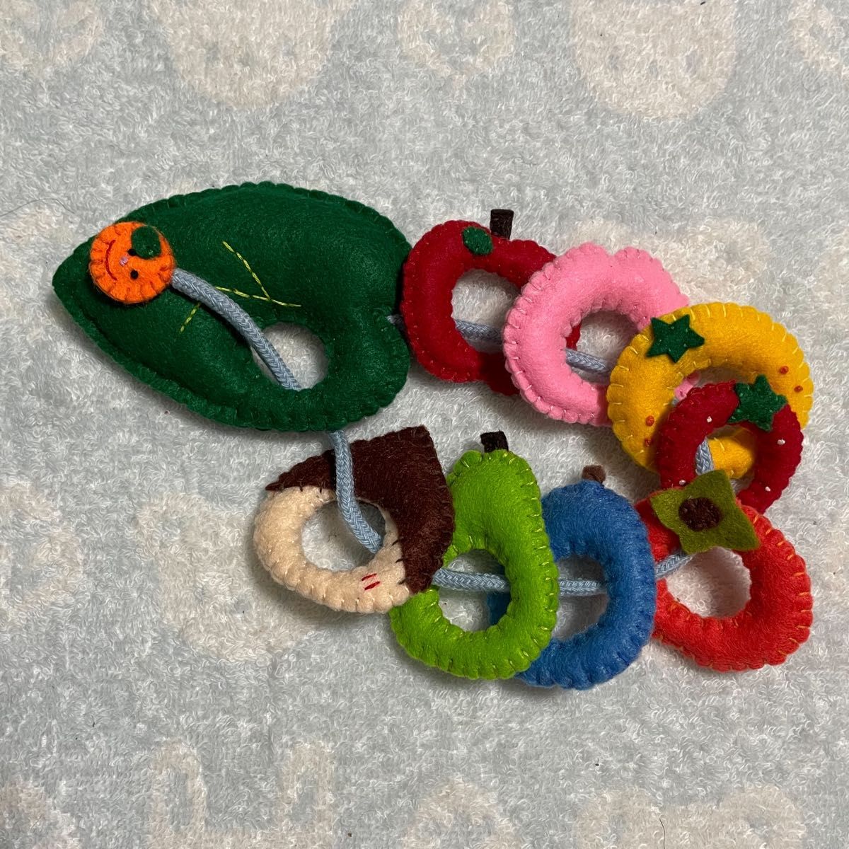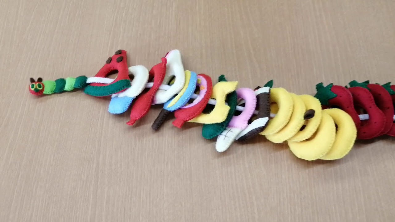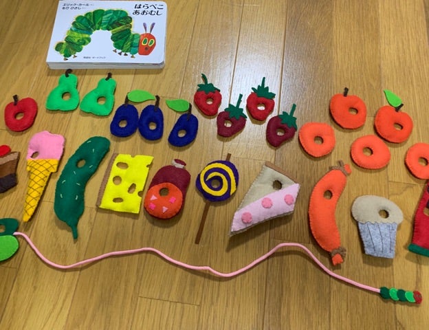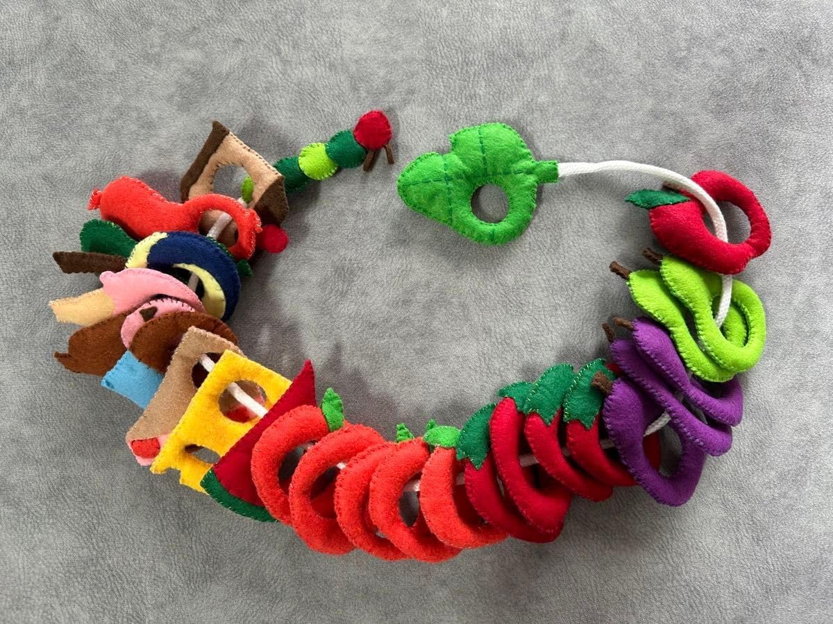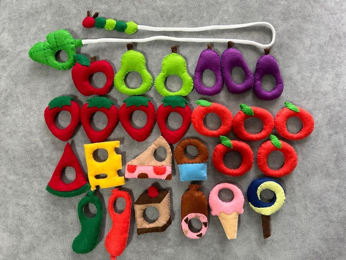 ヒモ通し はらぺこあおむし風フェルト 保育園 ままごと 手作り。