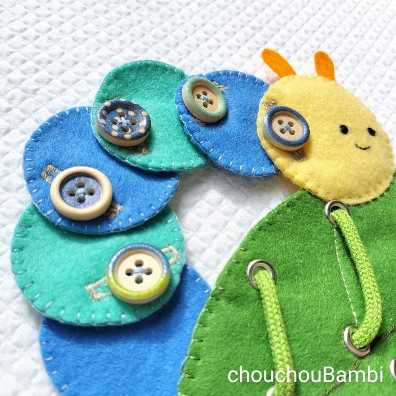 再販 紐通しG フェルトおもちゃ知育玩具ひも通しあおむし 保育療育介護教材手作り。