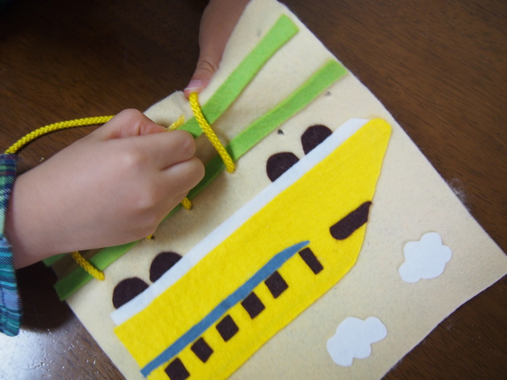 お受験専門店品質 紐を通して線路を作ろう!手作りフェルト教材 ひもとおし でんしゃお受験用品のお店 ハッピークローバ。