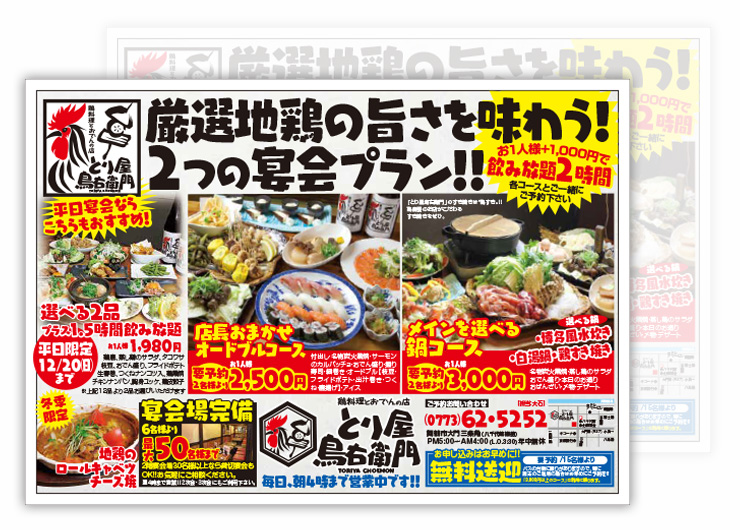 とり屋鳥右衛門様の宴会プランフライヤーパンフレット制作しチャオ。