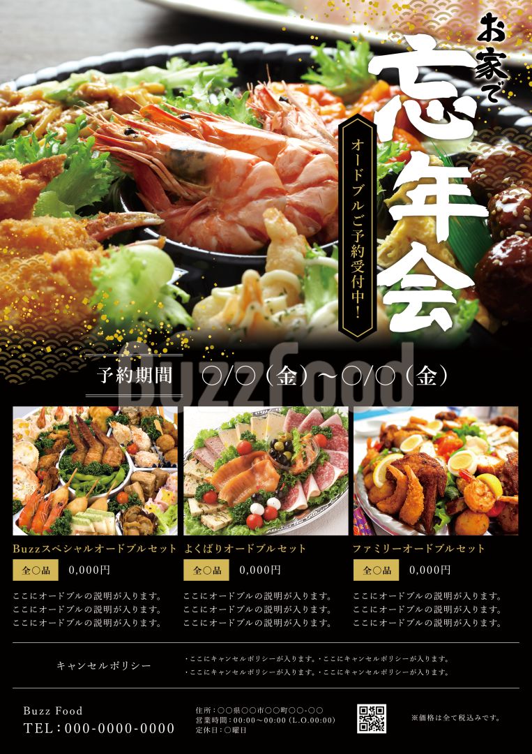 忘年会オードブルのチラシ 和食や居酒屋にオススメ カラー:黒 縦レイアウト - BuzzFood。