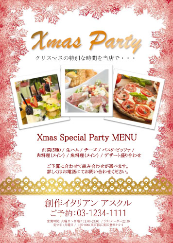 いろんなメーニューの写真を使ったパーティープランのチラシ の無料チラシテンプレート 10962 - デザインAC。