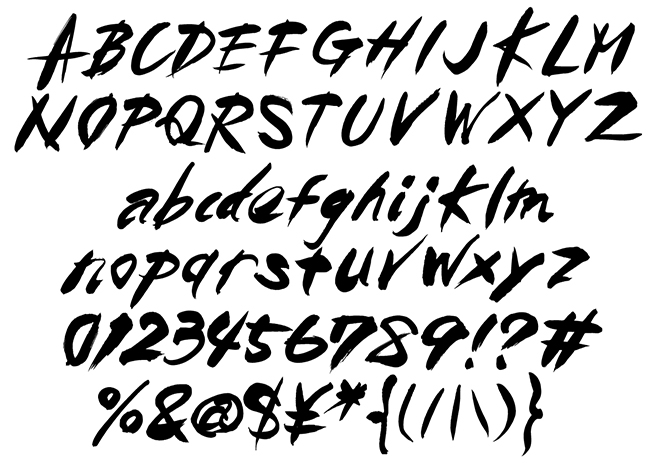 フリー素材筆で描かれた英語フリーフォント。荒々しいタッチが迫力のある雰囲気。