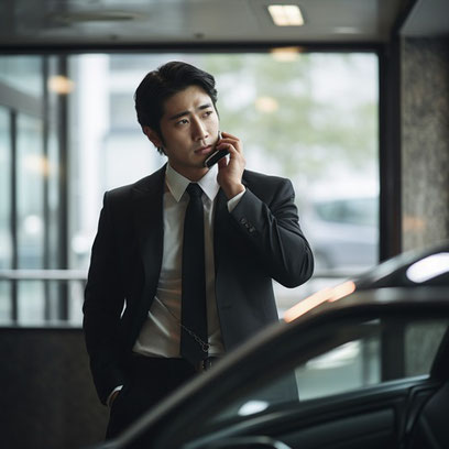 z41.会社の前で電話するサラリーマン 人関連 無料画像 - QREON素材ノート。