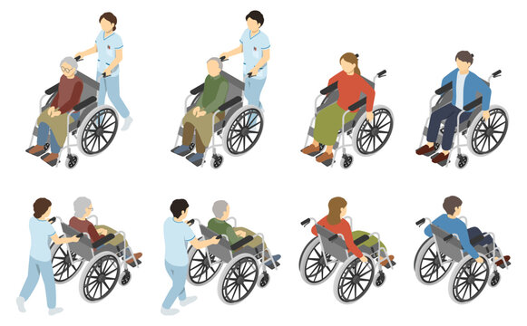 アイソメトリックは、運動障害のある人の人間のキャラクターを含む孤立したカラフルな画像の人々のセットを無効にします無料ベクトル素材。