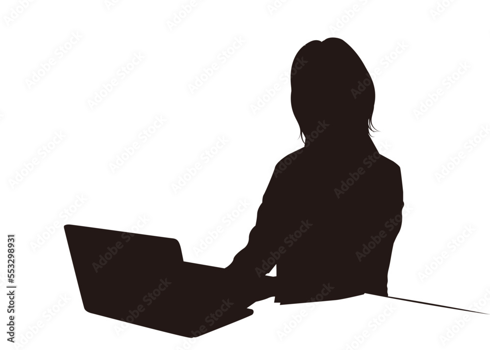 パソコン作業中の女性シルエットイラスト デスクワーク・上半身・白背景Stock VectorAdobe Stock。