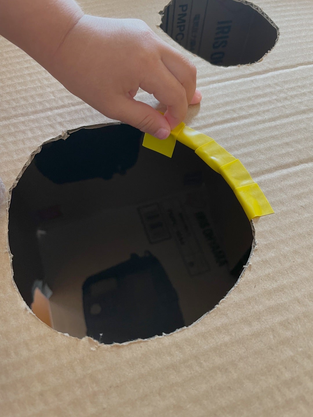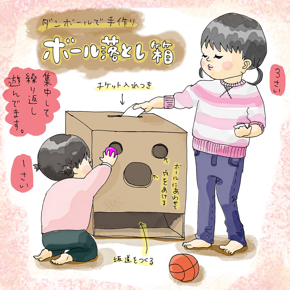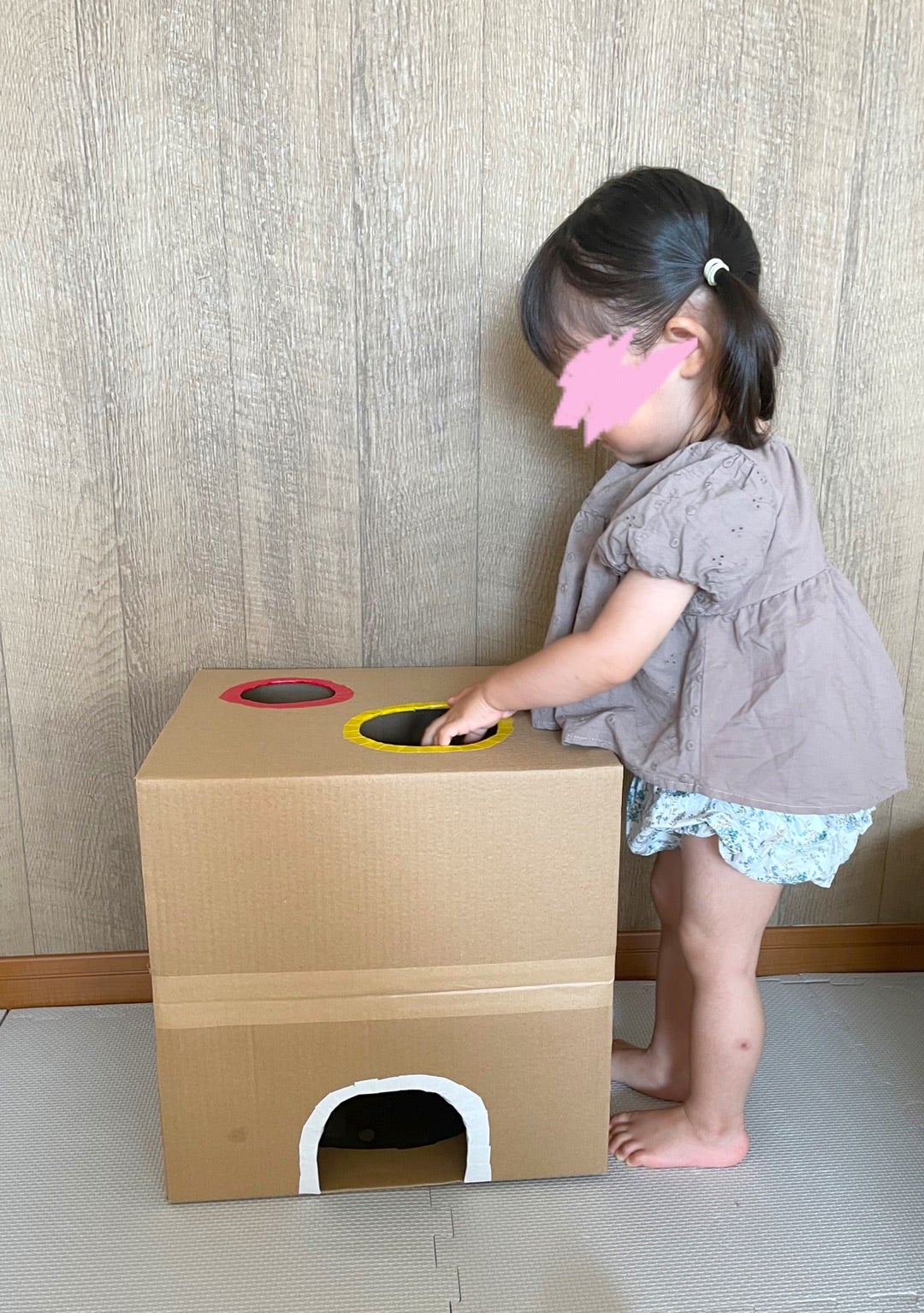 1y11m17d 簡単手作りおもちゃ 1歳児と一緒に作る、ダンボールのボール落とし好奇心を育てる おうち育児ログ ─0〜5歳の子どもと楽しむ、絵本・知育・食育のある暮らし。