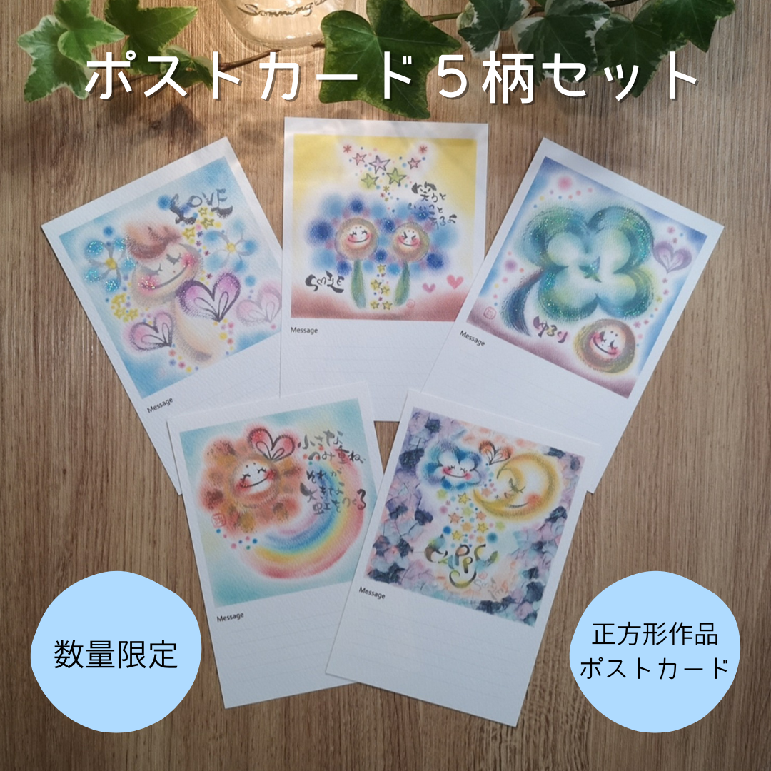 ポストカード5柄セット⑤ メッセージ欄あり数量限定 ラメ入り わだのめぐみデザイン メッセージカード インテリア 癒し かわいい おしゃれカラフル パステル 筆文字 アート ちょっとしたプレゼント女性 友達 20代 30代 40代 50代 -Komorebi ギフトモール店。