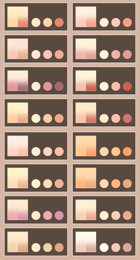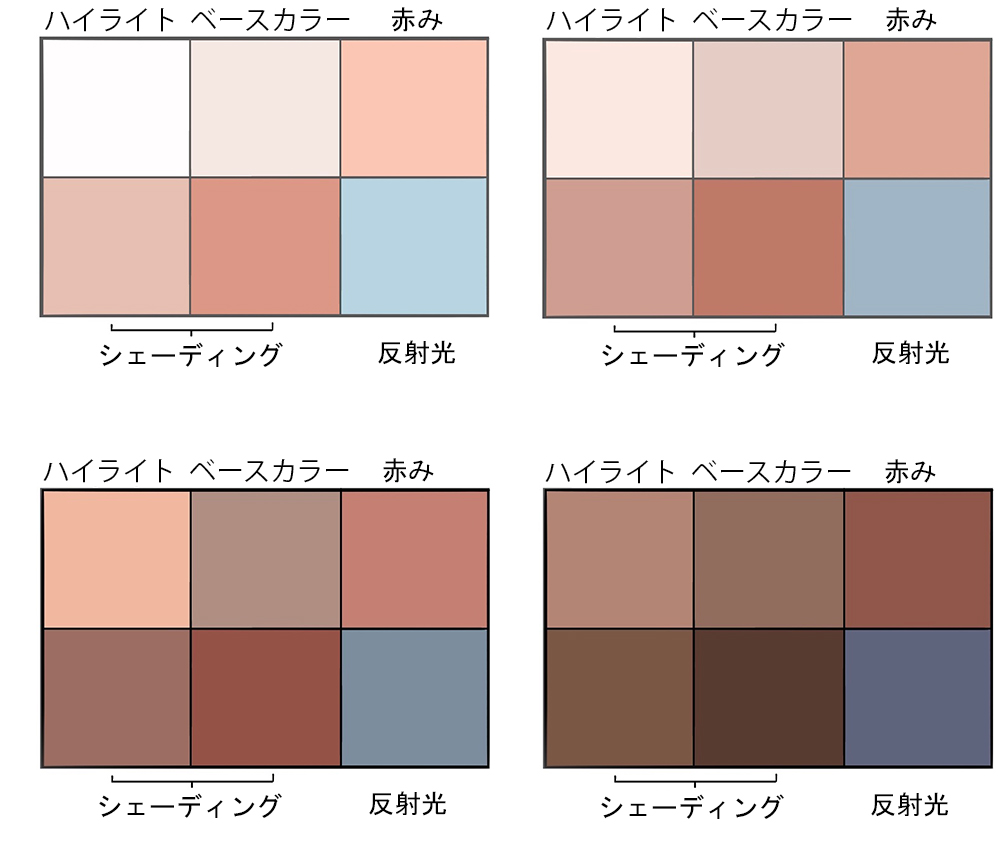 制服詳細図鑑02デザイナーズ制服 on X: "褐色系肌のパターンを追加した肌色 見本。人によってかなり色使いは違うのであくまで自分の塗り分けパターンとして目安程度に。ベース色の面積が広いと同じパレットでもまた印象が変わるハズです。アニメ塗りの場合はひとつ中間色を。