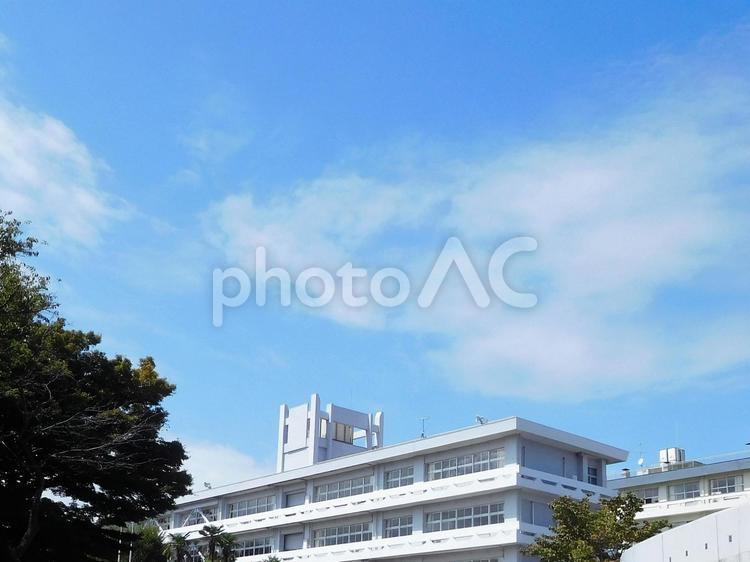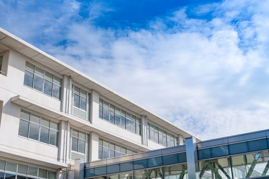 フリー素材学校の校舎と空を撮影した写真素材。空を大きく切り取った構図。