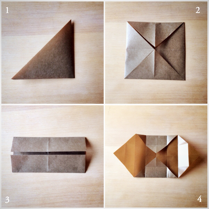 紙を使ったラッピングアイデア。正方形の紙を折って、ちょっとした小箱に。