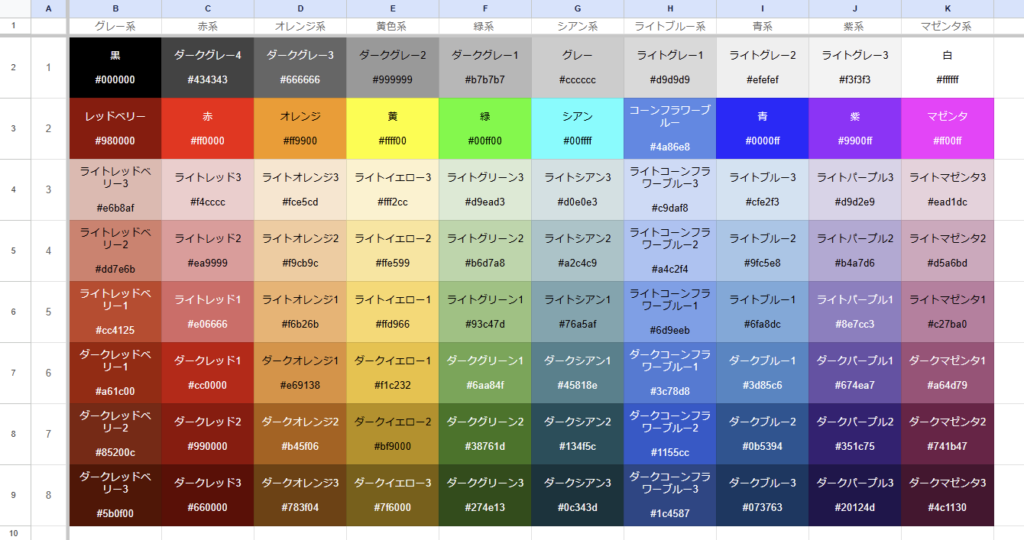 Googleスプレッドシートの標準カラーパレット一覧 色見本テンプレート合同会社橋爪オフィス。