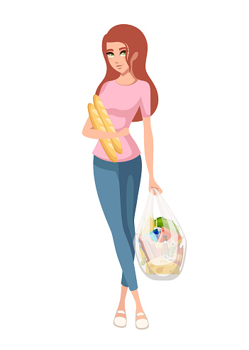 手に食べ物とパンの完全なビニール袋を持つかわいい女性白の背景に分離されたフラットベクターイラスト漫画のキャラクターデザイン -いっぱいになるのベクターアート素材や画像を多数ご用意 - iStock。