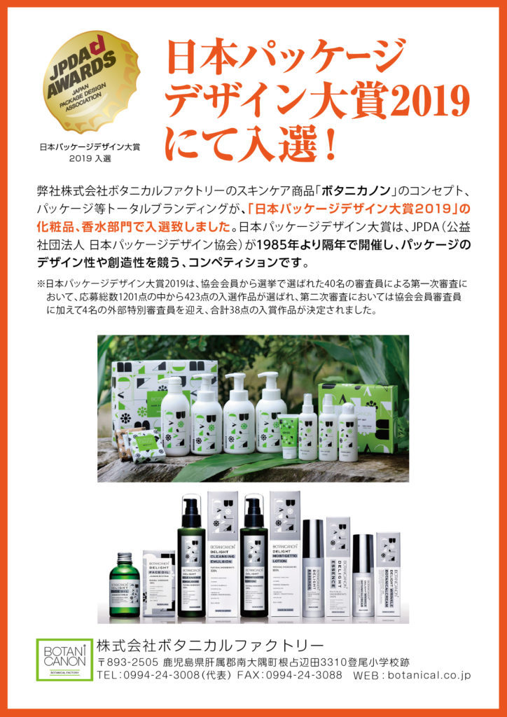 日本パッケージデザイン大賞2019 化粧品・香水部門 入選!ボタニカルファクトリーEthical & Sustainableな化粧品のOEM。