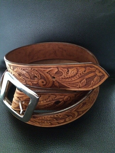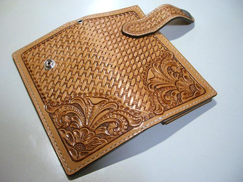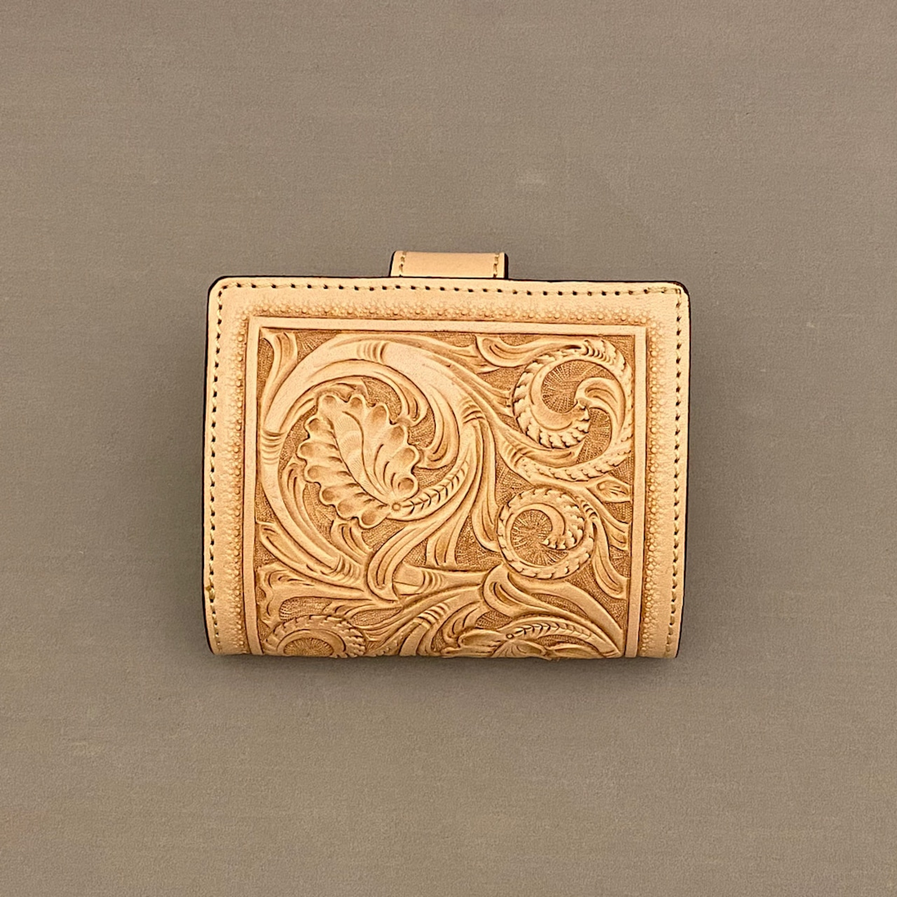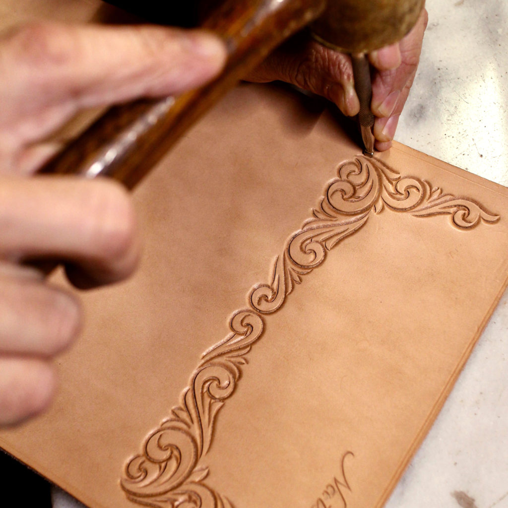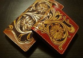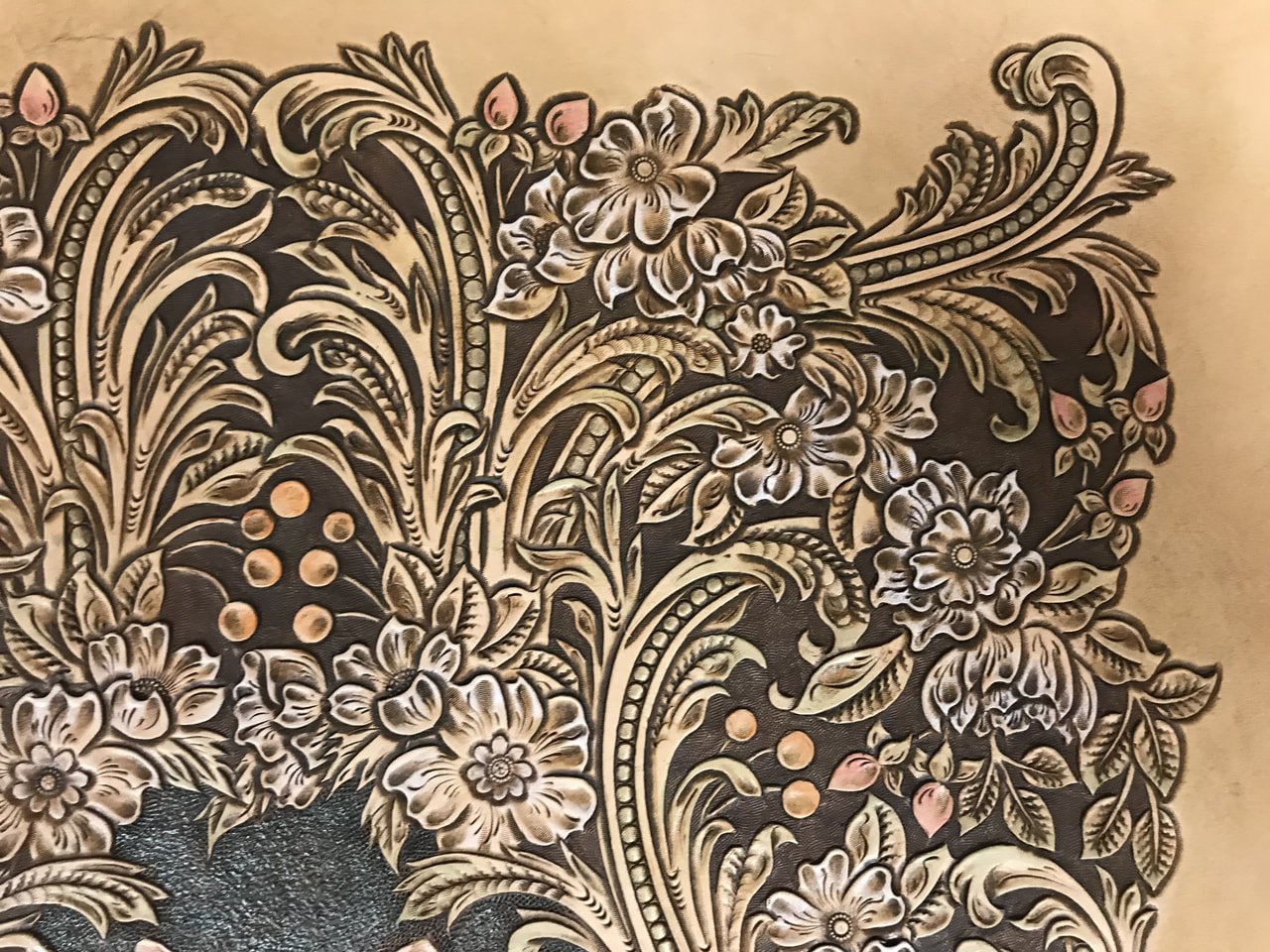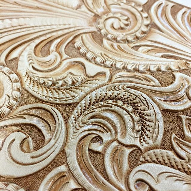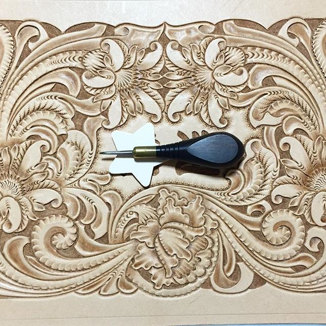 シェリダンスタイル・レザーカービング カットワークから複数の刻印を使用して革に打刻して唐草模様を描いてますレザークラフトレザーカービングハンドメイドハンドクラフト革職人ハンドメイド作家アメカジスタイルアメカジ皮雕工藝革工藝皮雕畫。