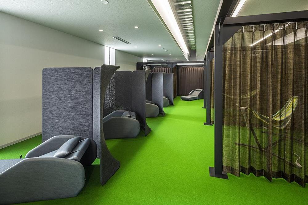 グリーンで開放的!内科クリニックの休憩スペースデザイン事例 - オフィスデザインの株式会社ワーク。