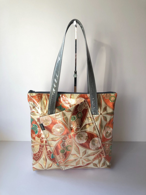 ✨帯リメイクトートバッグビニールコーティング紋章柄キャロットオレンジ色。