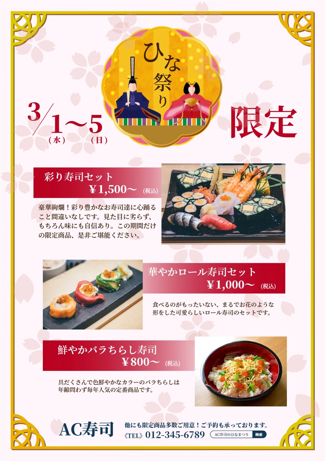 飲食店の限定メニューをお知らせするひなまつりのポスターの無料ポスターテンプレート 12171 - デザインAC。