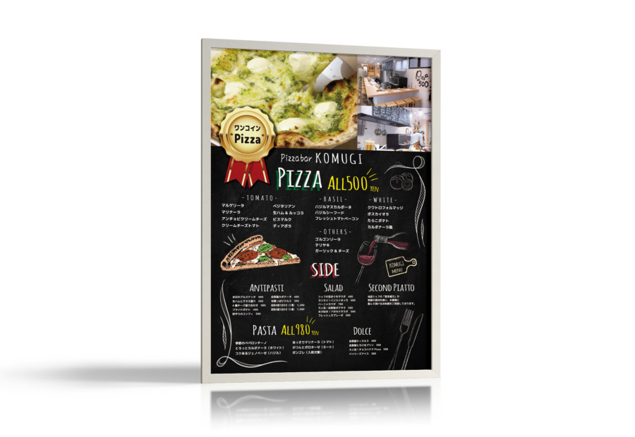 ポスター制作事例 – PIZZA BARのメニューポスターデザインASOBOAD。