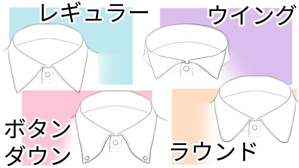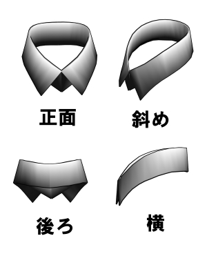 Yシャツの襟の描き方。ボタンの開 閉、正面 斜めから見た例を解説お絵かき図鑑。