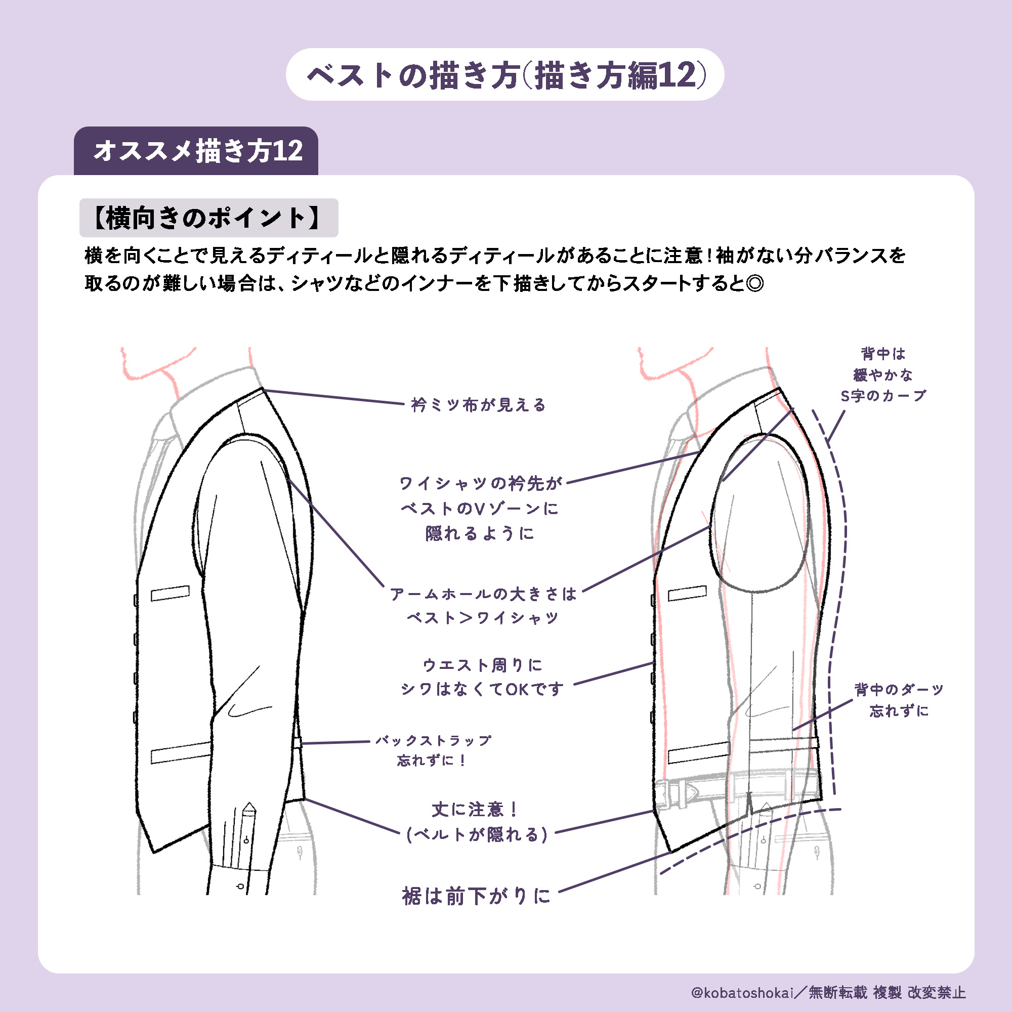 海藤 ルンルンサボテンマン on X: "ベスト 描き方編12 横向きのポイント 横を向くことによって見えるディティール、隠れるディティールがあることに注意!インナーとのバランスを取るために、ワイシャツを先に下描きしてからスタートすると◎ #服の描き方 https:t.co。