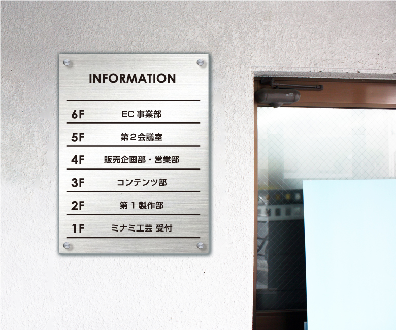 固定式 インフォメーションサイン ステンレスヘアーライン H600×W450×t2mm 化粧ビス止め 案内板 ビル案内板 フロア案内板 案内サインビル看板 会社銘板 事務所看板 屋外 屋内 おしゃれ エントランス 会社の看板 IFO-S-6045。