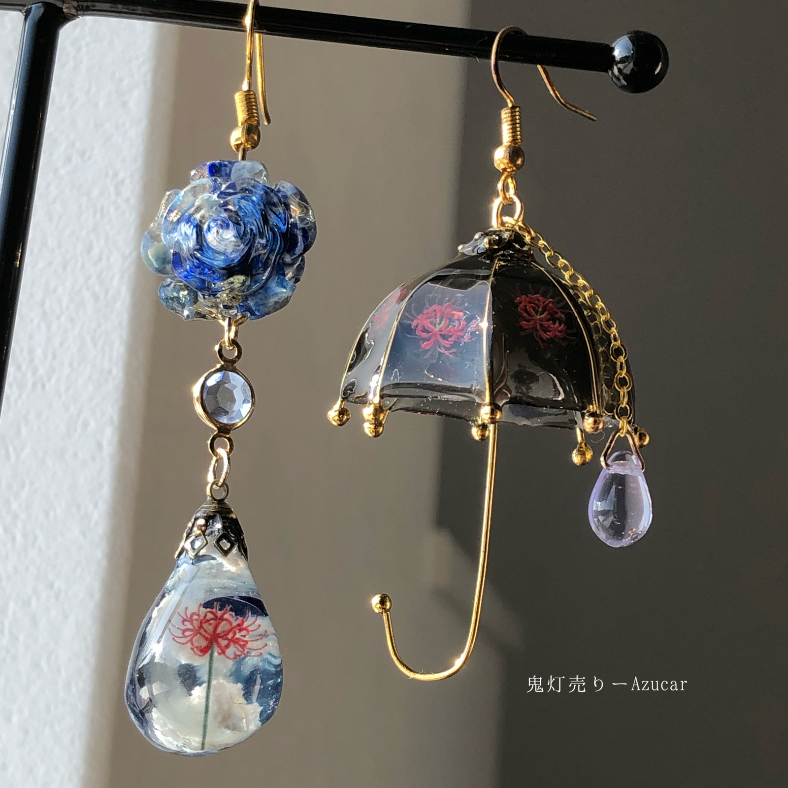 彼岸花の傘と青薔薇には空雫。 オルゴナイト 傘レジン 雲レジン ピアス。